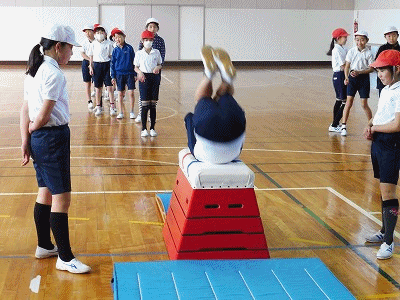 台上前転の練習やテストをしていました。練習の時はサイドに子どもたちの補助がついて、横から落ちてけがをしないように配慮していました。