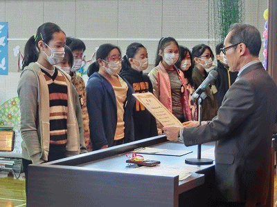 最初に先日行われたバスケットボールの大会で準優勝したバスケットボール部女子と優秀選手に選ばれた男女各1名の表彰がありました。