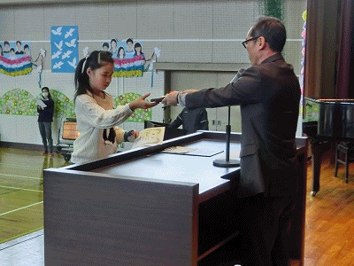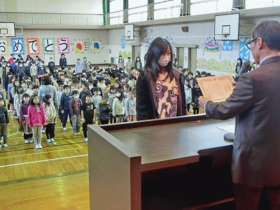 次に小牧市民体育大会の新体操で優秀な成績を収めた児童の表彰、なわとび大会の8の字跳びで優勝したクラスと新記録を樹立したクラスの表彰がありました。また、1年間でたくさん本を読んだ児童や、ワゴン点検やすこやかデーのチェックで優秀な成績を収めたクラスの表彰がありました。