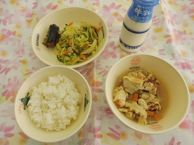 ごはん、肉豆腐、さんまのみぞれ煮、キャベツの塩昆布あえ、牛乳