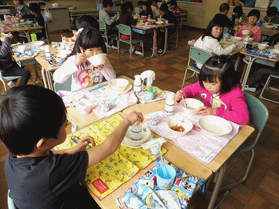 下の写真は1年1組の様子です。中華めんは子どもたちが好きなメニューの一つです。「昨日の夜も塩ラーメンだった」という声が聞こえてきました。