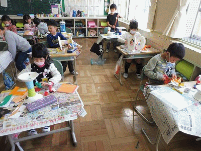 図工の時間(1年生) 公開日 2018/03/13 更新日 2018/03/13 1年生の部屋 「コロコロゆらりん」 紙ざらや紙コップなどを使って、転がるおもちゃを作っています。形はすでにできあがっているので、色を塗ったり飾りをつけたりしていました。とっても楽しそうに活動しています。