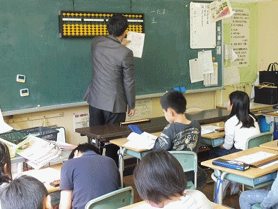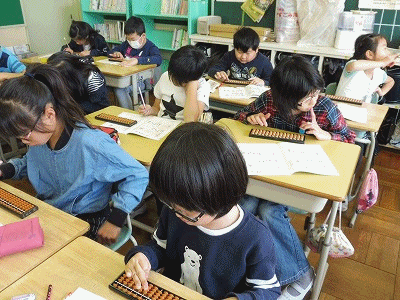 そろばん指導の先生方お二人に来ていただき、そろばんの基礎を教えていただきました。そろばんに初めて触れる児童もおり、みな真剣に先生の話を聞いていました。