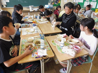 3月15日(木)の給食 公開日 2018/03/15 更新日 2018/03/15 6年生の部屋 こんだて ごはん、みそおでん、いわしの梅煮、白菜のおかかあえ、牛乳 下の写真は6年2組の様子です。中学校に行くと、服部先生が作るおいしいおにぎりを食べられなくなってしまいます。