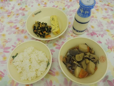 ごはん、がめ煮、愛知の五目厚焼きたまご、ツナとわかめのいためもの、牛乳