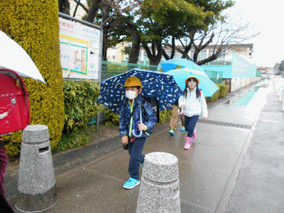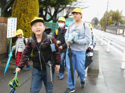 今日の登校風景です。今日から6年生がいない通学斑での登校です。