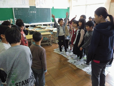 2年2組は、新聞紙を使った「無人島崩壊ゲーム」で楽しんでいました。