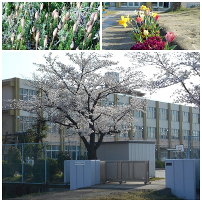 あたたかな日が続き、桜も満開です。今日の最高気温予想は25度と、暑いぐらいの一日になりそうです。校内のいろいろな花もきれいに咲き誇っています。