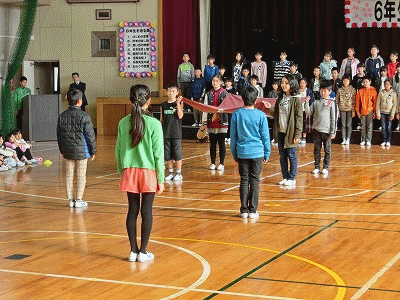 写真上:6年生を送る会、通学団遊び、志村先生による2年生の毛筆指導の様子