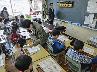 写真中:3年生そろばん指導、パトロールボランティアさん感謝の会、家庭科の授業の様子