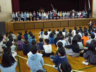 よろしくお願いします 公開日 2018/04/09 更新日 2018/04/09 学校生活の部屋 担任の先生に導かれて新1年生がステージに上がり、2年生から6年生と対面しました。6年生の代表児童が歓迎の言葉を述べました。その後1年生全員で『よろしくお願いします』のあいさつを元気よくしました。とってもかわいくて初々しい1年生の様子が見られました。