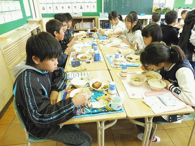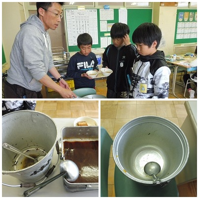 下の写真は6年1組の様子です。準備が早い上に、食缶が空っぽになるほどよく食べます。さすが6年生です。