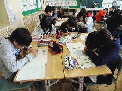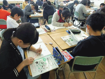 対称図形について学習していました。高学年になると写真のように小グループで学習することが多くなります。大きな集団だと分からないことを聞きづらいものですが、少人数だと比較的抵抗なく聞けるからです。また、聞かれた方も相手に分かるまで教えてあげられるという利点もあります。