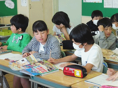 このクラスは男女市松模様と呼んでいるコの字型隊形で学習をしています。この座席配置も、子どもたちが主体的に学習できるようにするためのものです。小グループの時と同じように近くの人と意見の交流がしやすいことと、全体で話し合うときもお互いの顔を見て話をしたり聞いたりできるという利点があります。