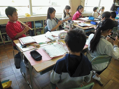 5年1組音楽の時間の様子です。ピタゴラスイッチのオープニングテーマを演奏していました。上手に吹けるようになったかな・・・?
