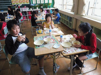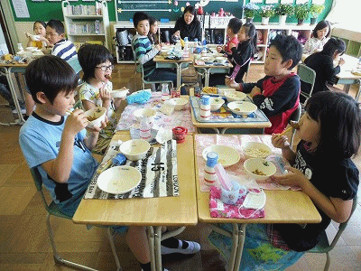 4月25日(水)の給食 公開日 2018/04/25 更新日 2018/04/25 4年生の部屋 こんだて 五目うどん(白玉うどん)、白ごまつくね、きんぴらごぼう、牛乳 下の写真は4年2組の様子です。このクラスの子どもたちは机をぴったりと寄せてグループを作って給食を食べています。些細なことかもしれませんが、こんな小さなことからも子どもたち同士の仲の良さが感じられます。