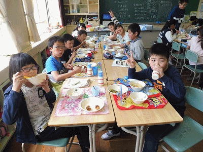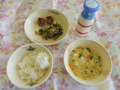 4月26日(木)の給食 公開日 2018/04/26 更新日 2018/04/26 5年生の部屋 こんだて ごはん、卵入り豆腐スープ、揚げシュウマイ、小松菜と桜エビ炒め、牛乳 下の写真は5年2組の様子です。子どもたちのすてきな笑顔がいっぱい見られました。