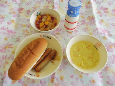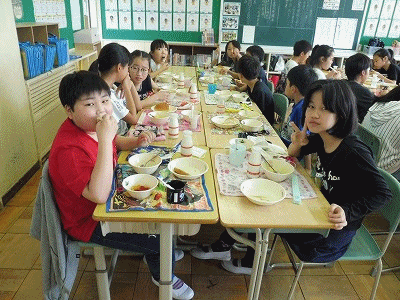 4月27日(金)の給食 公開日 2018/04/27 更新日 2018/04/27 6年生の部屋 こんだて ミルクロールパン、コーンクリームスープ、ウィンナーのケチャップソース、ぶどうゼリーミックス、牛乳 下の写真は6年2組の様子です。このクラスも机がぴったりとくっついて、整然としています。6年生は準備が早いので、ゆっくりと落ち着いて食べられます。