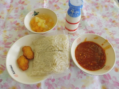 5月16日(水)の給食 公開日 2018/05/16 更新日 2018/05/16 1年生の部屋 こんだて ソフトめん、ミートソース、チキンナゲット、ナタデココフルーツ、牛乳 下の写真は1年2組の様子です。ソフトめんも、子どもたちが好きなメニューの一つです。どの子もおいしそうに、そして楽しそうに食べていました。