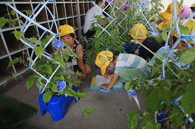 アサガオの花がたくさん咲いています。花やつる、葉っぱの様子などを一生懸命にスケッチしていました。