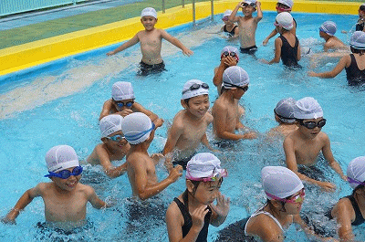 早速プールの時間です。プールの中を同じ方向に回って、渦を巻き起こします。その流れに乗って泳いだり、流れに逆らって歩いたりしていました。子どもたちは、この「洗濯機」が大好きです。