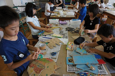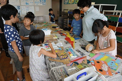 切ってつないで大変身(3年生) 公開日 2018/07/04 更新日 2018/07/04 3年生の部屋 いろいろな形ができあがっていました。色をぬって完成です。段ボールが、恐竜や人形、ロボットなどいろいろな形に変身しています。