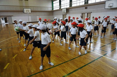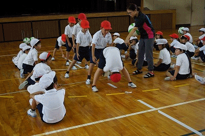 体育館でボールを使った基本の運動をしていました。いろいろな方法で次の人にボールを送っていきます。