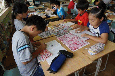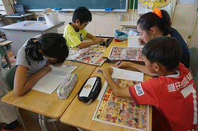 熱心に広告を調べています。スーパー等のチラシから、食品の産地を調べているようです。調べたことをもとに、気づいたことや分かったことを、グループで話し合っていました。