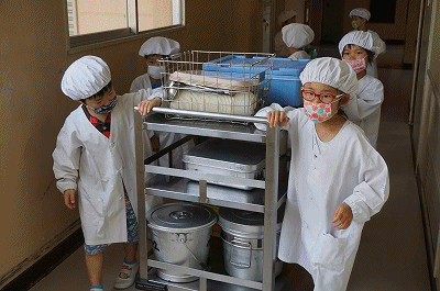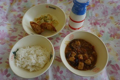 7月17日(火)の給食 公開日 2018/07/17 更新日 2018/07/17 1年生の部屋 こんだて ごはん、マーボーなす、揚げぎょうざ、きゅうりのごましょうゆ、牛乳 下の写真は1年生が給食の準備をしている様子です。上手に盛り付けができるようになりました。