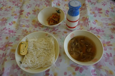 五目うどん(白玉うどん)、ねぎ玉焼き、にんじんとツナの炒めもの、牛乳
