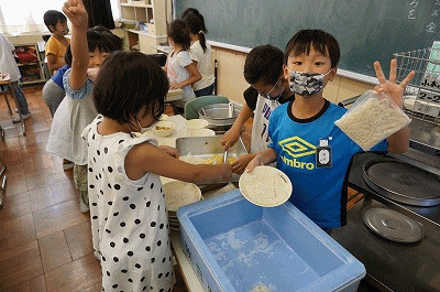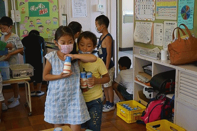 下の写真は2年生の給食準備の様子です。1学期は今週で終わりということで、給食当番はエプロンを着けずに当番活動をしています。