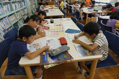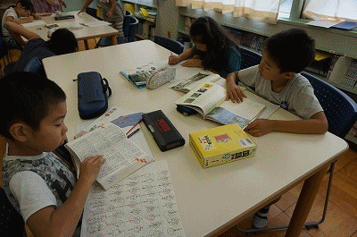 図書室で学習していました。辞書や図鑑を使って調べ学習をしている子、漢字テストや漢字テストの間違い直しをする子など様々でした。