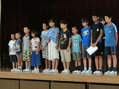 小木ソフトボールクラブ、小木サッカークラブで優秀な成績を収めた児童、小牧市陸上競技大会で標準記録を突破した児童、あいさつの標語・ポスターで素晴らしい作品を作った児童が、壇上に上がり校長先生から表彰状を手渡されました。よくがんばりましたね!