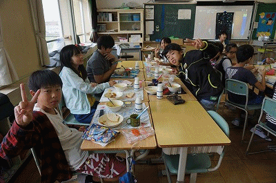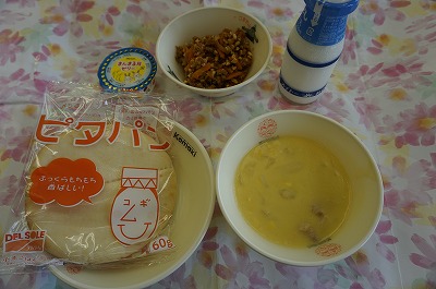 9月21日(金)の給食 公開日 2018/09/21 更新日 2018/09/21 6年生の部屋 こんだて ピタパン、豆乳入りコーンスープ、スラッピージョー(ミートソース)、お月見ゼリー、牛乳 下の写真は6年2組の様子です。十五夜は9月24日のようですが、振替休日で給食がないため、一足早くお月見ゼリーが出ました。 「スラッピージョー」聞き慣れない名前ですが、子どもたちに大好評。ピタパンにはさんで、おいしくいただきました。