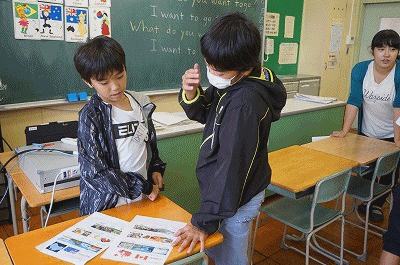 中学校で学習する内容ですが、子どもたちは抵抗なく取り組んでいます。子どもたちは、会話の仕方を練習した後、それぞれの国の名所や観光地が書かれたカードを持って、友達と先ほどの会話をしていきます。英語だけでなく外国の文化等にも触れられる活動です。