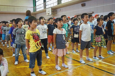 今日も雨にたたられてしまいました。やむなく体育館で校歌の練習をしました。元気いっぱいの声が体育館の中に響き渡りましたが、運動場ではどうでしょうか?ちょっと心配も残りますが・・・、仕方ないですね。