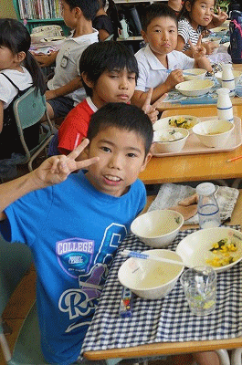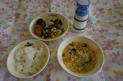 9月27日(木)の給食 公開日 2018/09/27 更新日 2018/09/27 3年生の部屋 こんだて ごはん、かきたま汁、いかフライのごまみそかけ、こんにゃくサラダ、牛乳 下の写真は3年1組の様子です。机をぴったりとくっつけて、みんなで仲良く会食しています。いいですね!