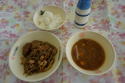 ごはん、呉汁、白ごまつくね、きんぴらごぼう、牛乳