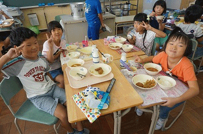 下の写真は2年2組の様子です。食欲の秋です。給食をたくさん食べて、みんな元気いっぱいです。