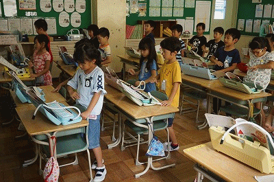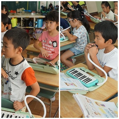 音楽の時間(1年生) 公開日 2018/10/09 更新日 2018/10/09 1年生の部屋 鍵盤ハーモニカの練習をしています。階名で歌ったり、音の高さを動作に表して歌ったりした後、鍵盤ハーモニカで実際に音を出していました。鍵盤を押す指使いが、少しずつ様になってきました。