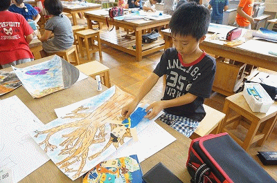 9月の半ばごろから始めた図工競技会の作品作りも終盤を迎えました。色塗が終わって、最後に主人公の「豆太」を貼りつけて完成です。