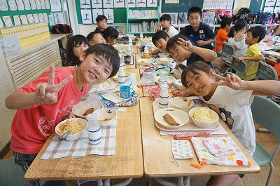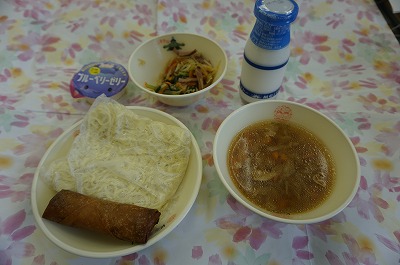 10月10日(水)の給食 公開日 2018/10/10 更新日 2018/10/10 3年生の部屋 こんだて しょうゆラーメン(中華めん)、春巻き、もやしの中華サラダ、ブルーベリーゼリー、牛乳 下の写真は3年2組の様子です。今日は子どもたちが大好きな中華めんです。みんなたくさん食べています。