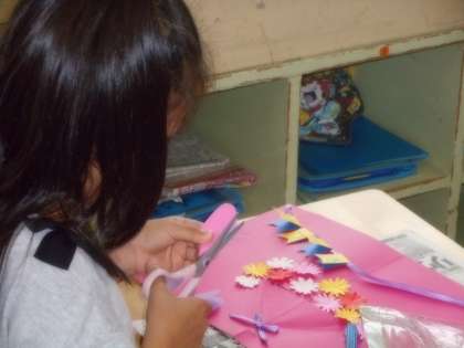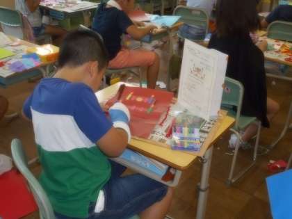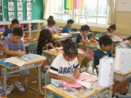 17日(水)の図工競技会に向け、「幸せを運ぶカード」の制作を進めました。今日は、「ア、平面から立体へ」「イ、文字から飾り文字へ」「ウ、暗い色から明るい色へ」の観点を示しながら、細かい部分まで丁寧に作品づくりに取り組むことをめあてにしました。カードをもらった相手が喜ぶように、気持ちを込めて粘り強く制作する児童がたくさん見られました。