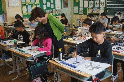 背筋をピンと伸ばし足をピタッと床につけたよい姿勢で、筆を立てて、肘が下がらないようにして書くと、それだけで生き生きとした字が書けます。また、一人ひとりに丁寧にアドバイスをしていただき、それを頭に入れて子どもたちは書写競技会に臨みました。志村先生、ありがとうございました。