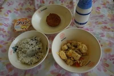 わかめごはん、高野豆腐の卵とじ、キャベツ入りメンチカツ、豆乳プリン、牛乳