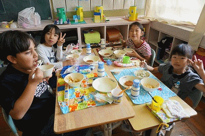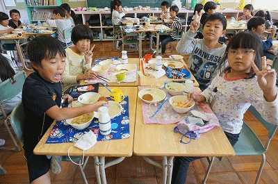 下の写真は2年1組の様子です。わかめごはんをおいしそうに食べていました。22日(月)には栗入り五目ごはんがでます。楽しみです。