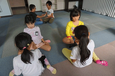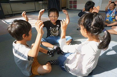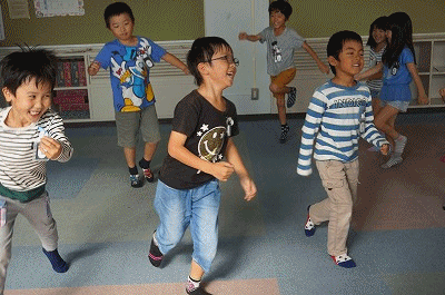1年2組の子どもたちが、とっても楽しみにしている校長先生の授業の様子です。ピアノのリズムに合わせて走ったり、スキップしたり、歩いたり、止まったり、子どもたちはノリノリです。2人、3人、4人など様々なグループを作って、「おちゃらか」や「なべなべそこぬけ」をやったりと、次から次へと活動が続きます。最後は曲に合わせて、体を動かしたり、ネコやイヌの気持ちになって踊ったりと、まさに「音」を「楽」しんでいました。
