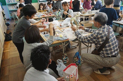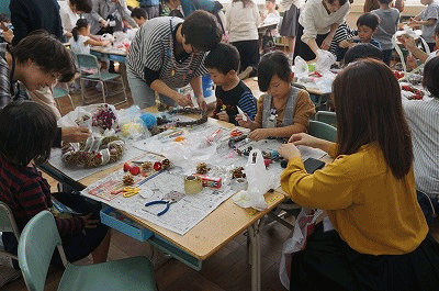 1年生の様子です。あさがおのリースを、親子で力を合わせて作っていました。