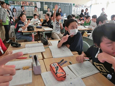 5年生の様子です。 写真上:5年1組 算数「分数」 写真下:5年2組 道徳「—自分の心に誠実に—『千羽鶴』」