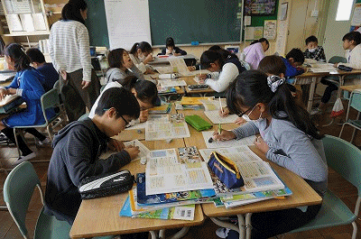 日本の食糧生産の問題点について、資料などをもとに調べてプリントにまとめていました。